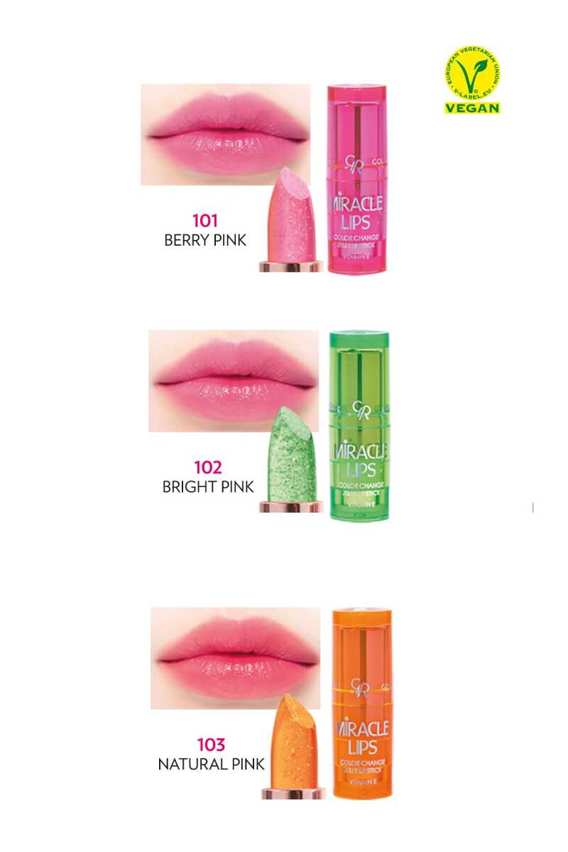 Miracle Lips Jelly Lipstick; Renk değiştiren jel ruj dudaklara doğal parlak bir görünüm verir. Vücut ısısına ve pH değerine göre dudakta renk değiştirir, dudakların doğal rengini arttırarak mükemmel pembe bir görünüm sağlar ve uzun süre dudakta kalır.Vegan formülü, içeriğindeki E vitamini ve nemlendirici bileşenler ile dudaklarınızı nemlendirir, yumuşatır ve besler.Pembe tonlarda renk veren hoş meyve kokularına sahip 3 farklı çeşidi vardır.