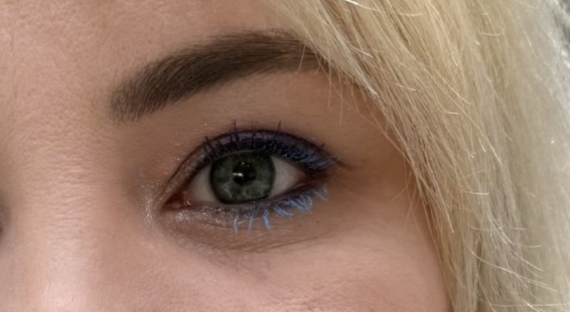 Rengi belirgin. Üst kirpikte mor üstüne hafif mavi, alt kirpikte tek mavi var. Beğendim.